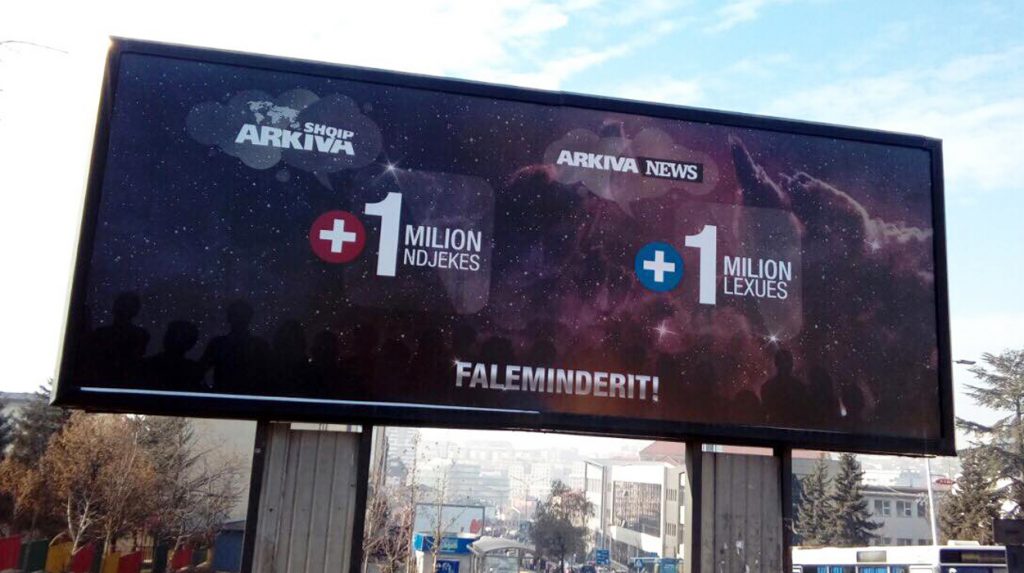Kanali më i madh shqiptar ArkivaShqip dhe portali ArkivaNews kanë zgjedhur një mënyrë origjinale për të falënderuar ndjekësit dhe lexuesit e përditshëm. Mirënjohja është virtyti më i lartë dhe ndaj asnjëherë nuk është e tepërt për ta shprehur atë. Tashmë në Prishtinë në Rrugën “Eqrem Çabej” një billboard falënderues do t`ju mirëpresë. Ky poster i dedikohet mbi 1 Milion ndjekësve dhe abonentëve në kanalin e YouTube, ndjekësve në rrjetet sociale dhe mbi 1 Milion lexuesve në portalin ArkivaNews.