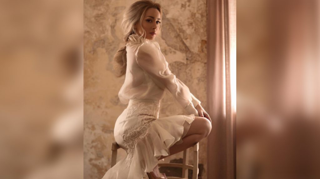 E ulur dhe e mbështetur te kolltuku është veshur me një rozë të lehtë, pastel, prej atllasi. Tyli në disa pjesë të veshjes e bënë edhe më sensuale.