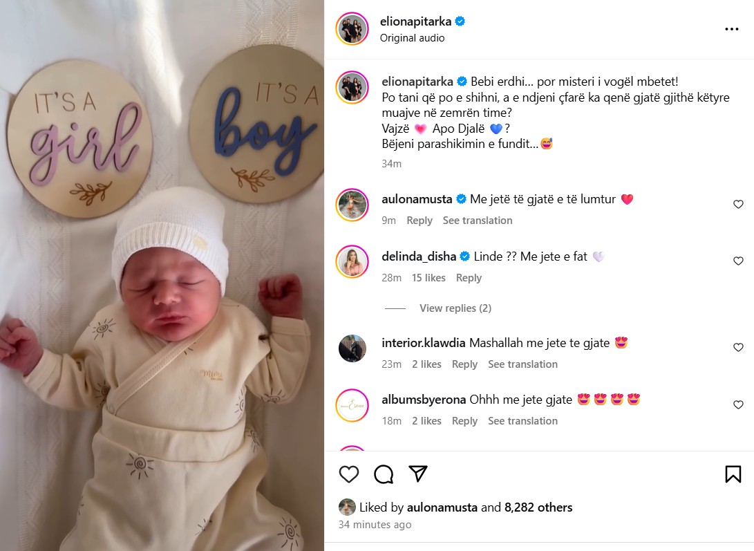 Krahas postit ajo ka marrë shumë urime të ëmbla nga miqtë dhe ndjekësit. Një pjesë e ndjekësve kanë hedhur dyshimet se familja është zgjeruar me një tjetër vajzë por ka dhe nga ata që e kanë uruar Elionën për ardhjen në jetë të një djali.